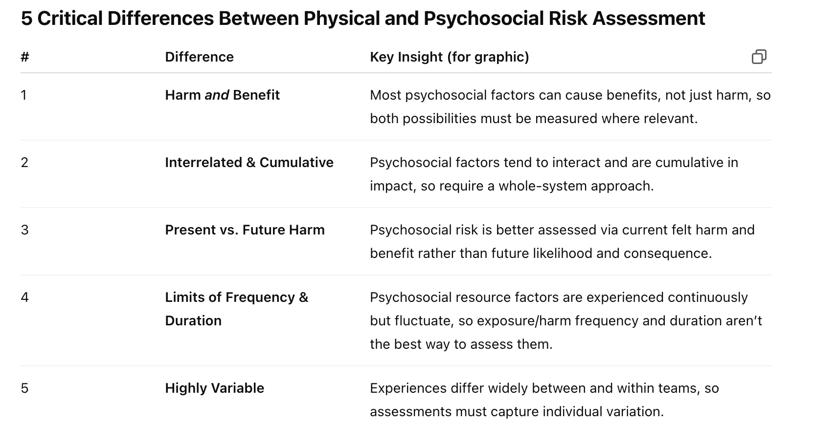 Therefore, traditional risk assessment based on likelihood × consequence is largely unnecessary for psychosocial risks. Instead, the psychosocial environment allows risk assessment of psychological injury or illness based on workers' actual reports of current felt harm and benefit, measured as prevalence × impact (harm severity or benefit significance).